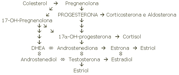 A progesterona não altera a masculinidade do homem? Não. Tanto no homem quanto na mulher, os hormônios sexuais (esteróides) são produzidos a partir do colesterol. Veja o diagrama abaixo, elaborado pelo médico John R. Lee: Seqüência básica